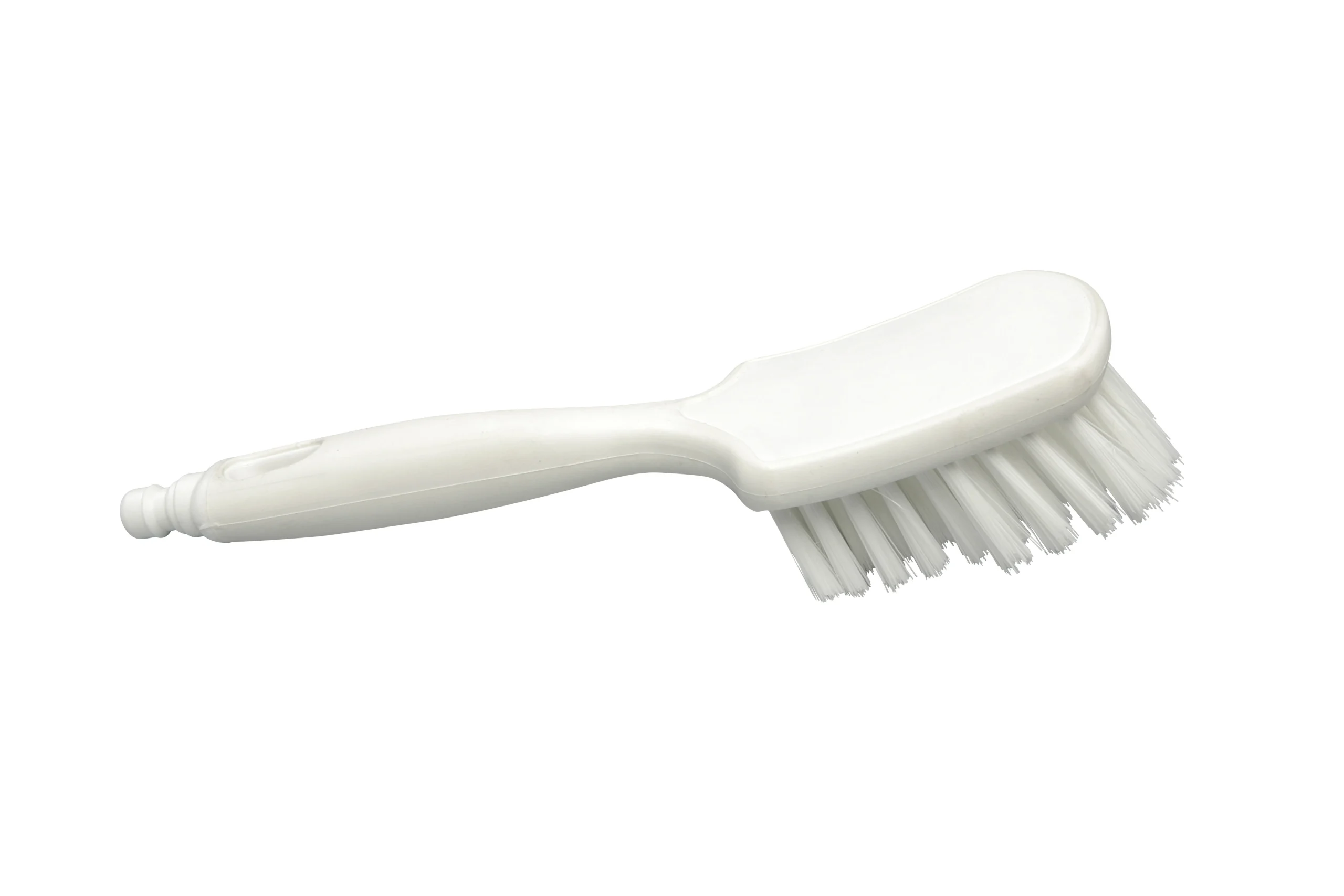 Cepillo de mano con paso de agua y borde de goma. Cerdas de rigidez media, PBT 0.30 y altura de 35 mm. Ideal para limpieza húmeda con flujo controlado.
