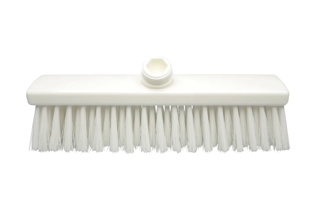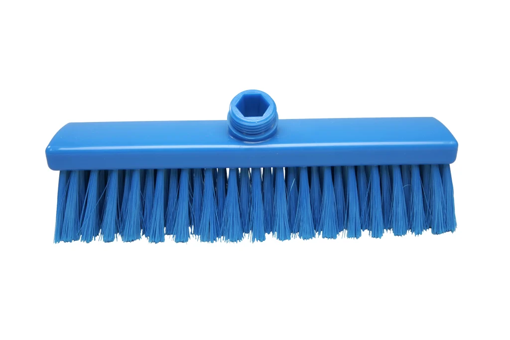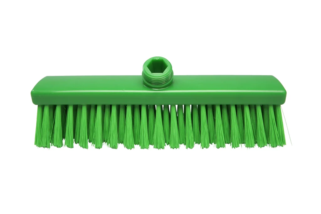 Escoba fabricada en polipropileno resistente, con filamentos de poliéster PBT de 0.30 mm y 55 mm de largo, seleccionados para un cepillado suave ideal para la mayoría de aplicaciones de limpieza ligera en suelos. Compatible con mangos de rosca externa estándar.