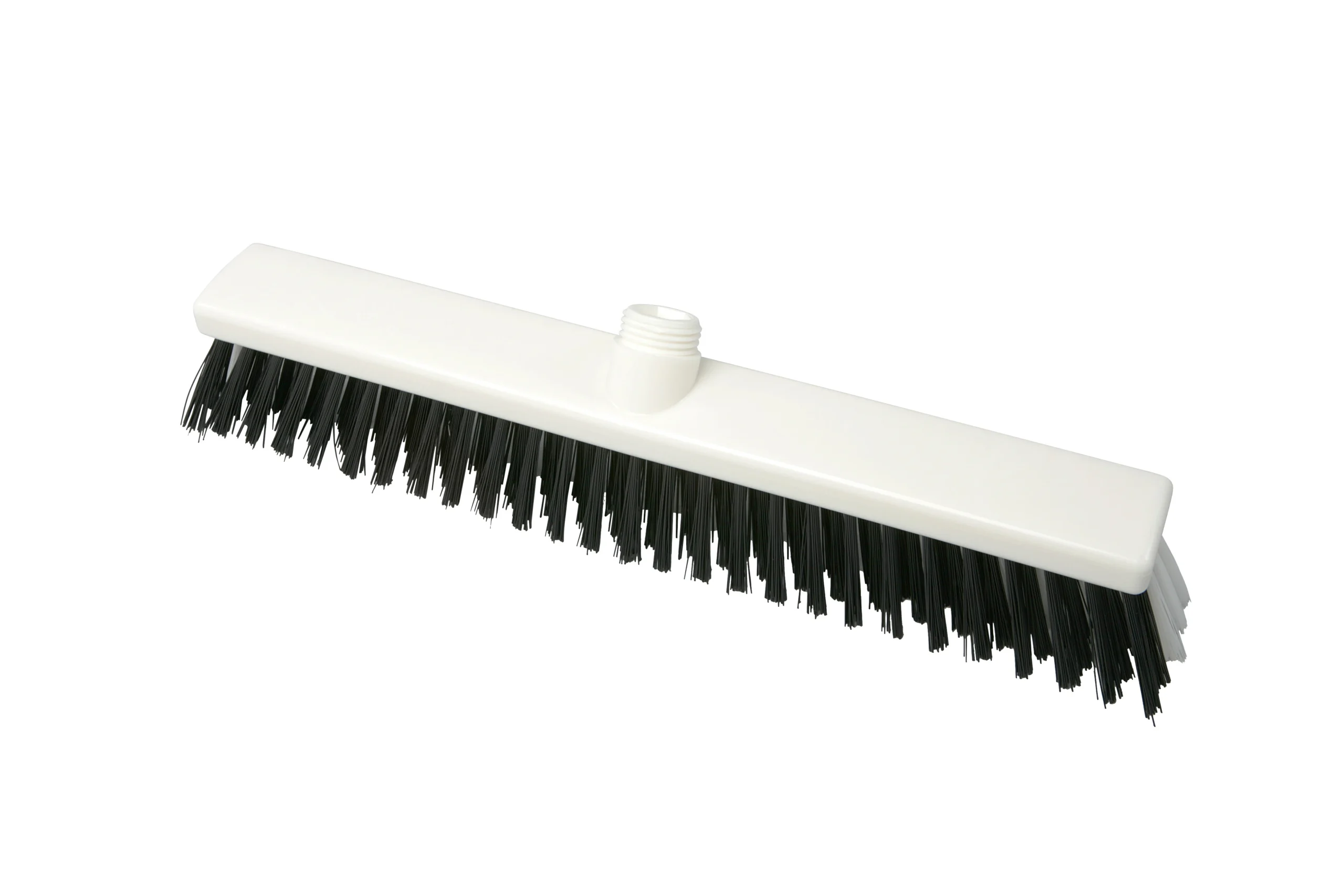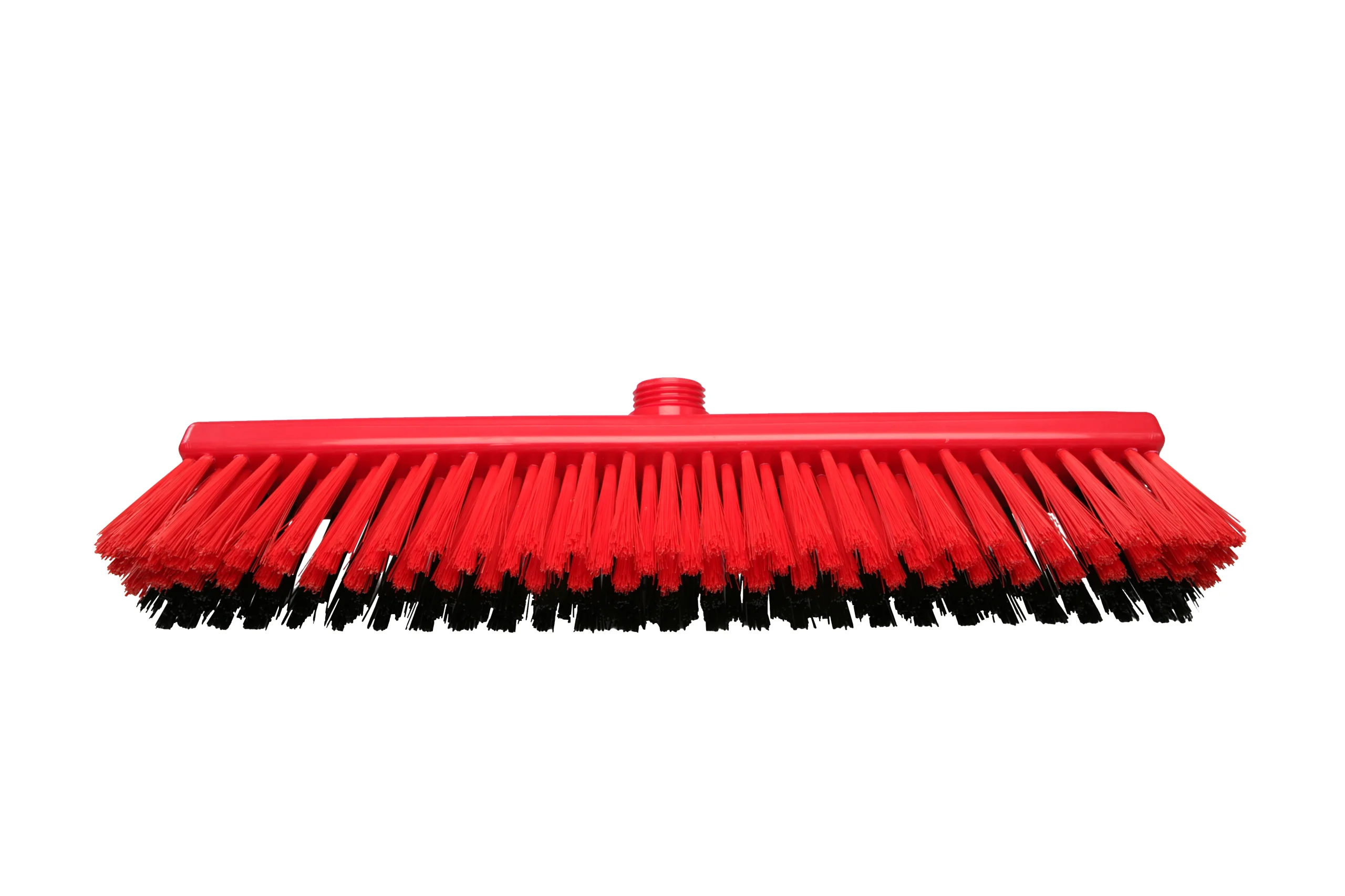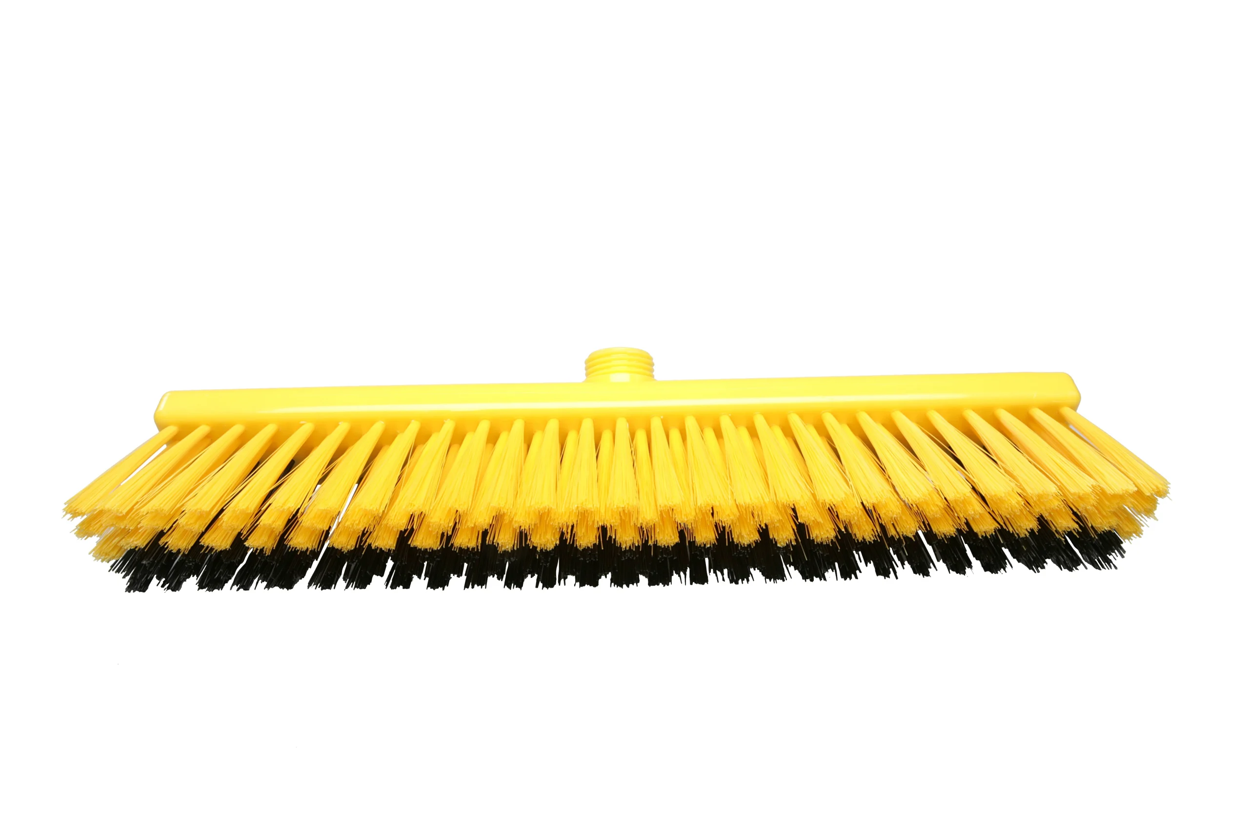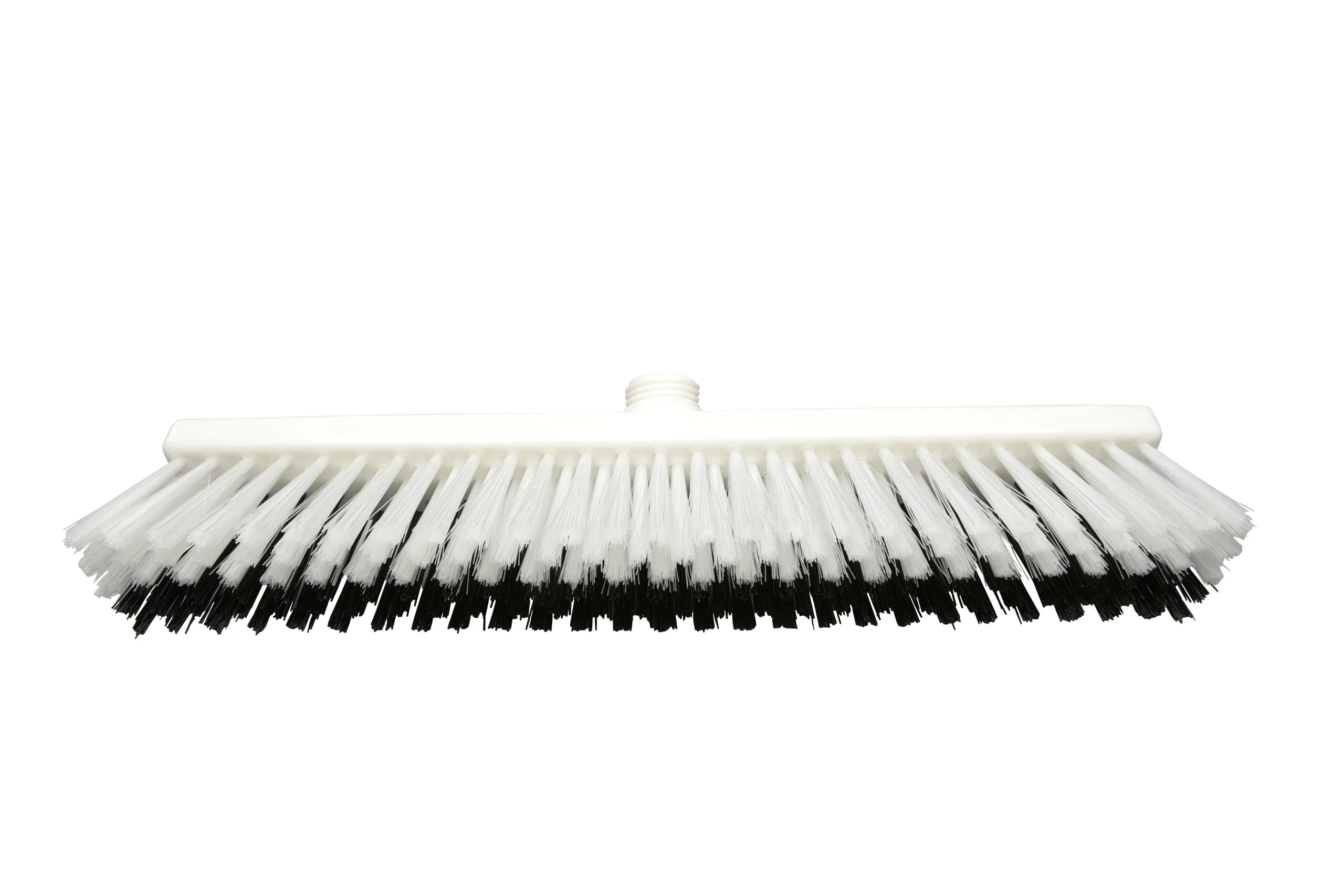 Escobillones combinados fabricados en polipropileno con filamentos de PBT en dos rigideces. Los filamentos frontales negros (0.70 mm) eliminan residuos incrustados, mientras que los posteriores más suaves (0.30 mm) capturan partículas finas. Ideal para una limpieza eficiente en pisos que combinan suciedad pesada con residuos livianos. Resistencia térmica de hasta 80 °C en uso y 134 °C para esterilización. Compatibles con mangos de rosca externa.