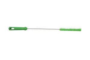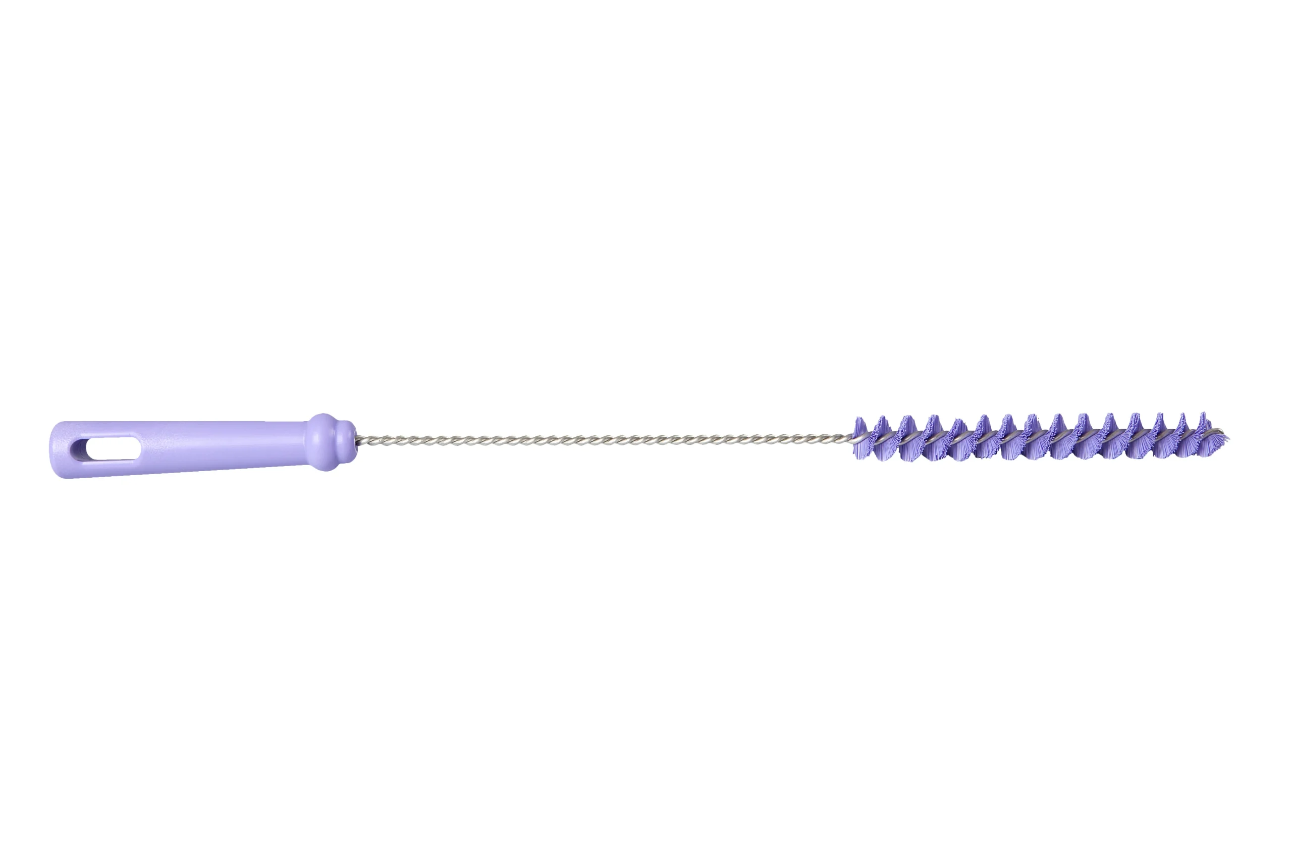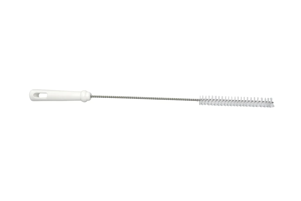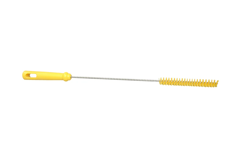 Cepillo de mano con mango largo y filamentos de poliéster PBT de dureza media, con radio de 20 mm. Ideal para limpieza detallada en tuberías pequeñas, permite acceder con facilidad para remover residuos y mantener la higiene en espacios estrechos y exigentes.