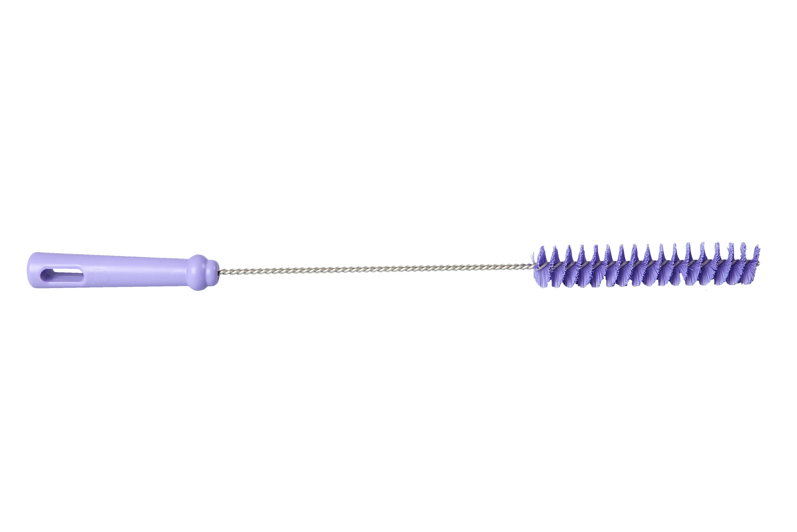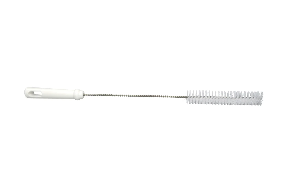 Cepillo de mano con mango largo y filamentos de poliéster PBT de dureza media, con radio de 40 mm. Indicado para tuberías medianas, permite acceder con facilidad para remover residuos y mantener la higiene en espacios estrechos y exigentes.