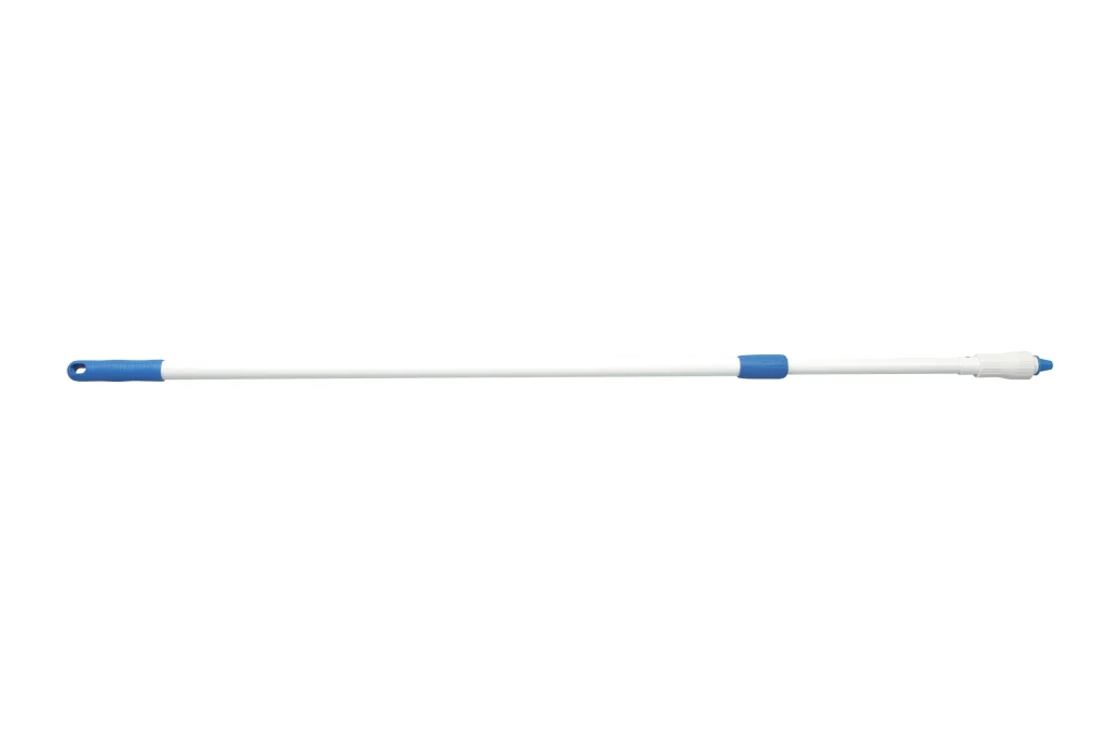 Mangos telescópicos de fibra de vidrio, altamente resistentes a impactos, productos químicos y corrosión. Su diseño extensible permite adaptar el largo según el uso, facilitando el acceso a zonas en altura o de difícil acceso. Son más livianos que los de aluminio, lo que mejora la maniobrabilidad sin sacrificar rigidez ni control. Superficie blanca fácil de limpiar, empuñadura azul antideslizante y conexión compatible con artículos de rosca externa. Soportan temperaturas de hasta 100 °C.